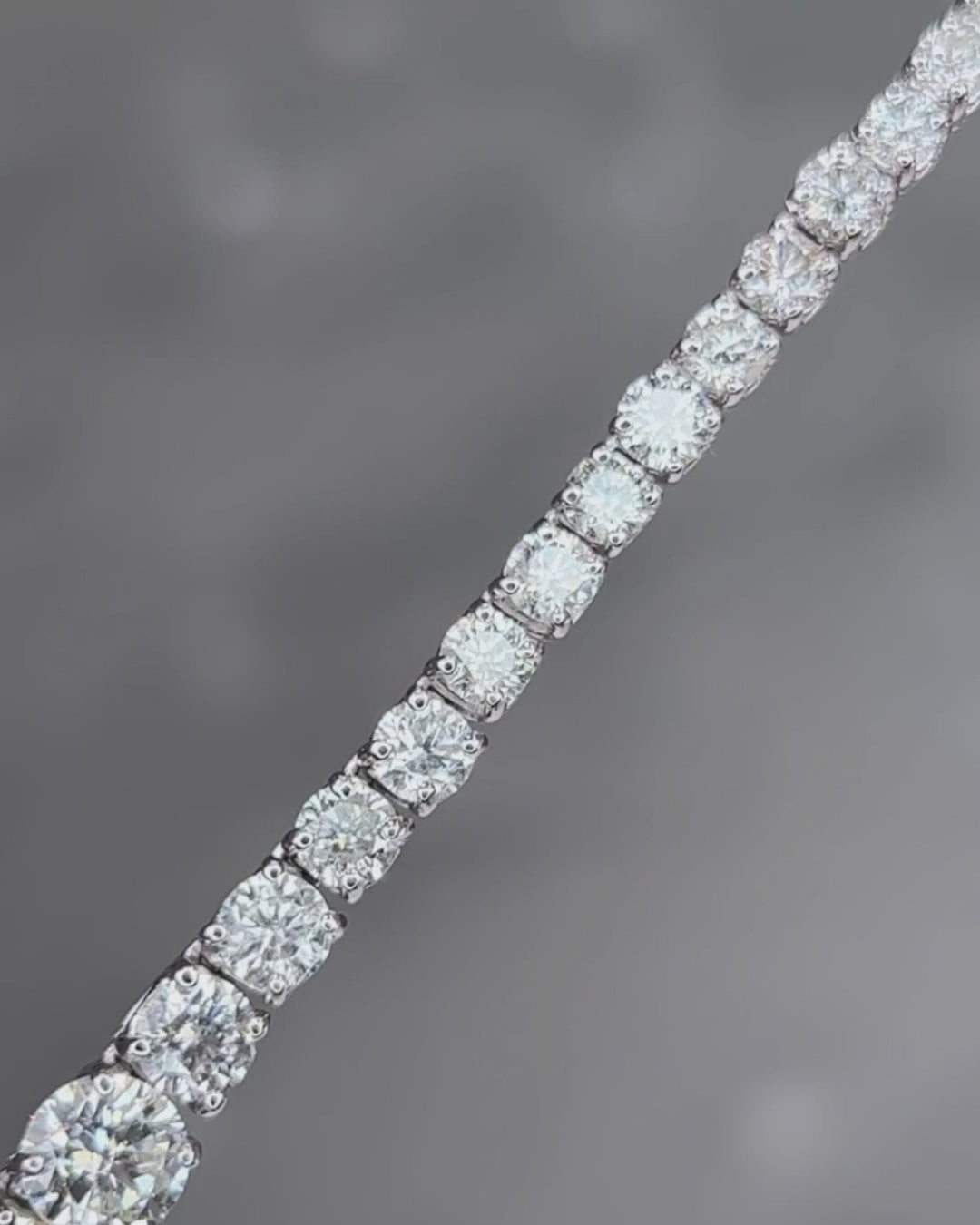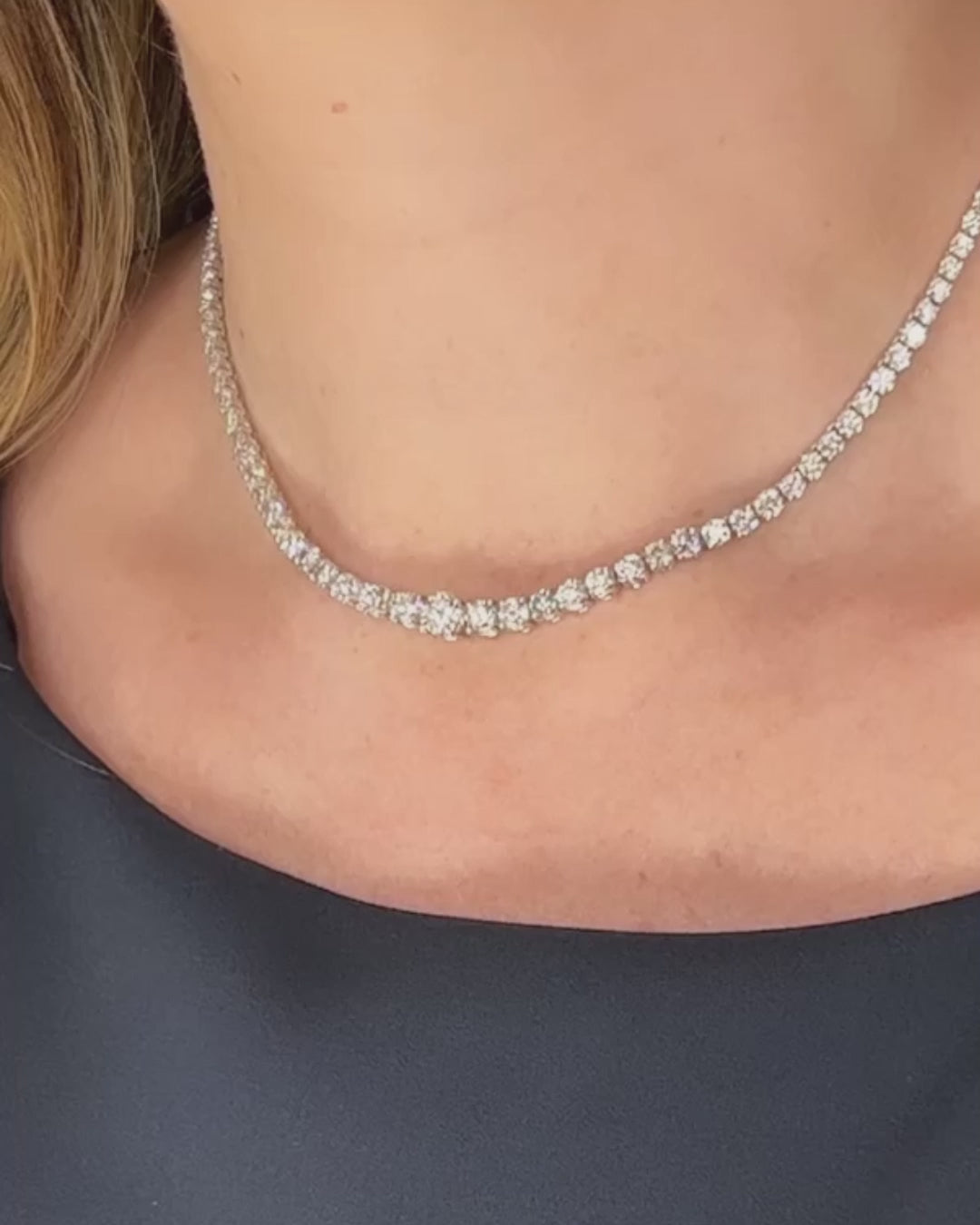 This beautifully radiant 15.78ctw Graduating Tennis Necklace is set and handcrafted in 18K White Gold. Complete with 125 graduating diamonds, this unique style provides maximum visual impact through it's unique design. With the largest diamond in the center of this piece, this necklace was created with ultimate versatility in mind over the classic tennis necklace style that we are familiar with.