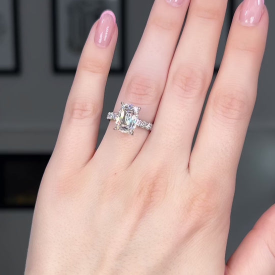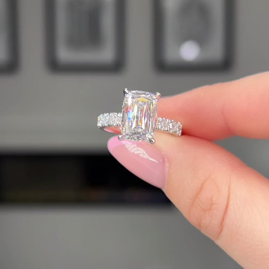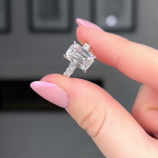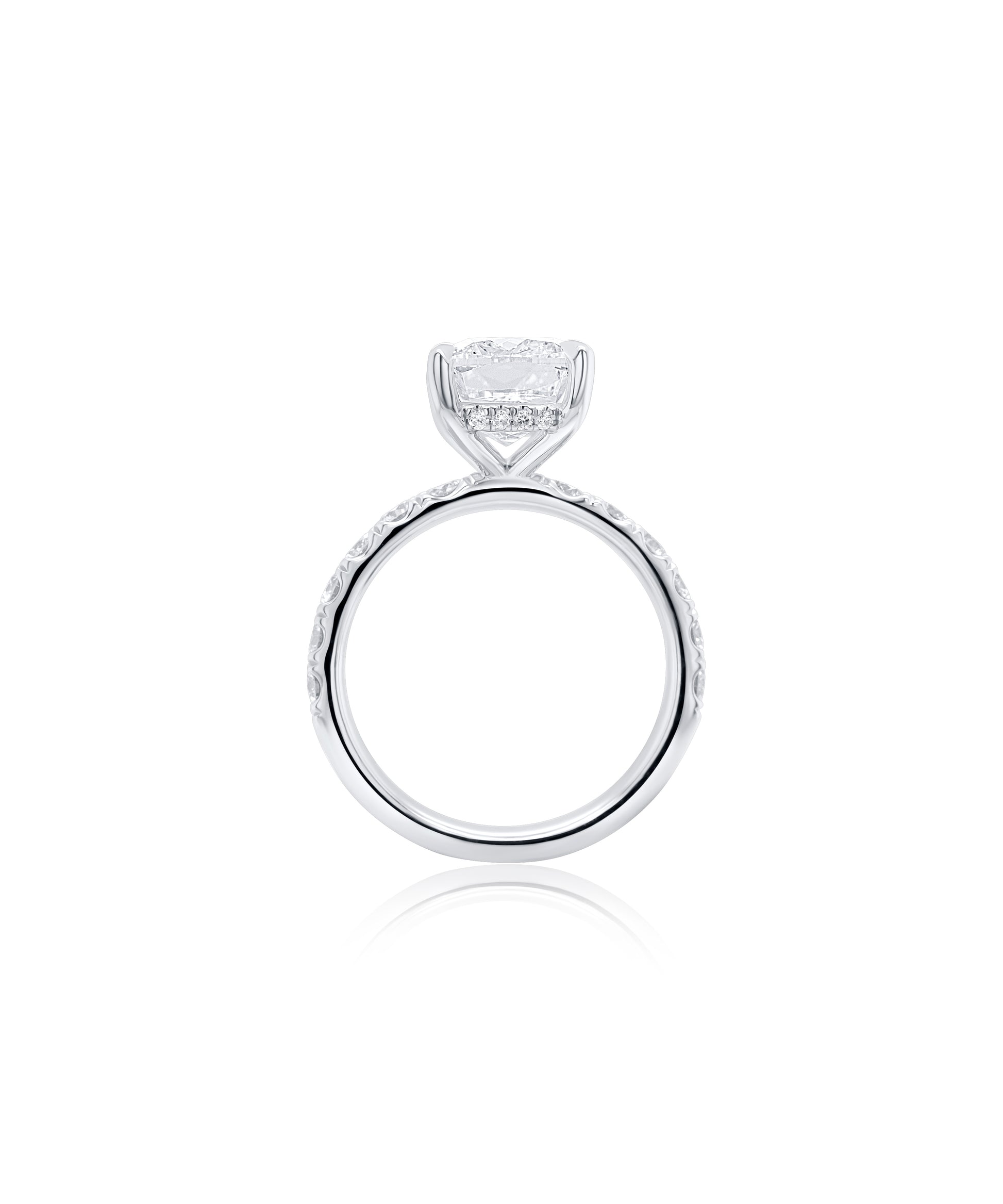 This exceptional diamond is masterly hand set in our diamond pave platinum setting, complete with a sparkling hidden halo. This stone is unlike any other, with it's unique faceting that is expertly crafted to intersect light in mesmerizing flashes; it creates an optical depth that shifts with every movement. Elegant, modern and one of a kind, this ring embodies the refinement that defines Boston Diamond Company's signature designs.