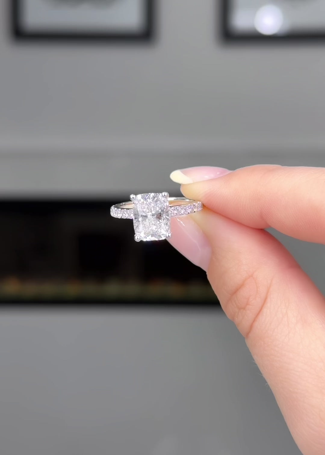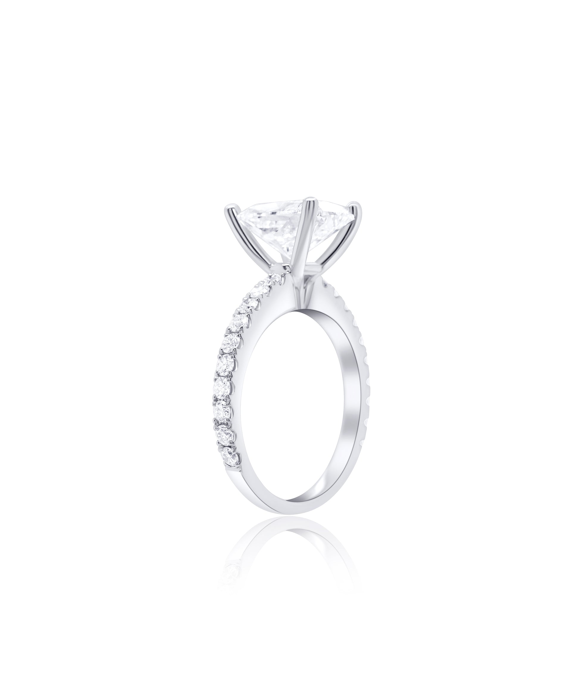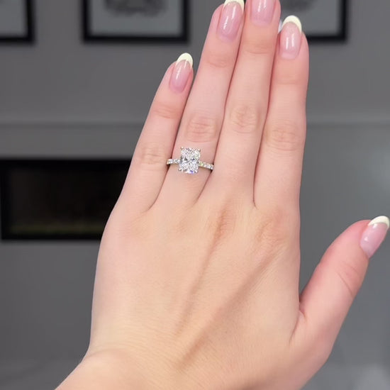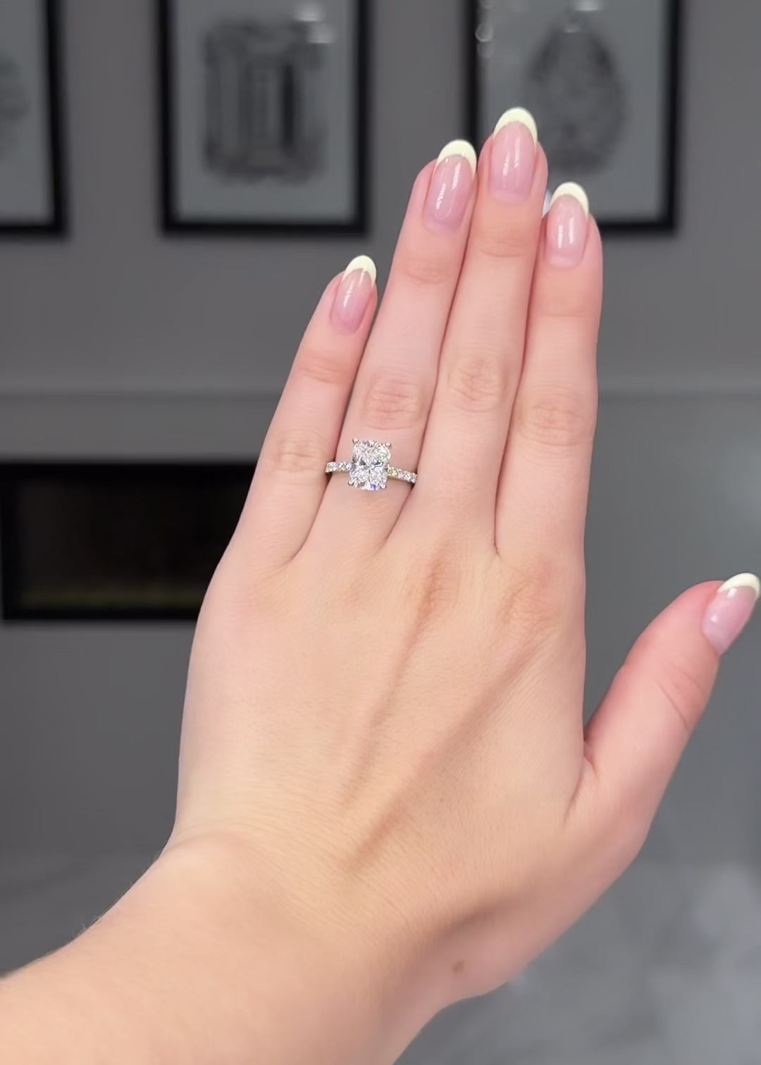 Romantic and endlessly luminous, this ring was designed around the connection of bringing two people together, forever. The subtly rounded silhouette of the center stone is elongated for a flattering and elegant look that captures light from every angle. This particular design feels modern but minimal, with the added touch of sparkle on the diamond band to complete it.
