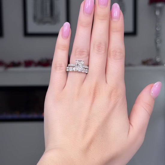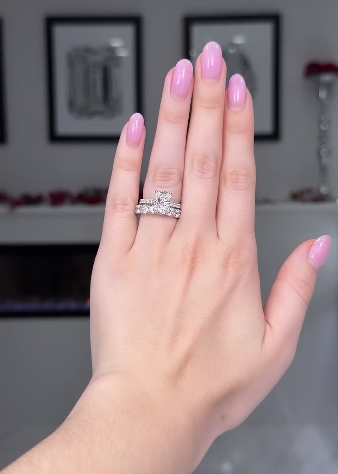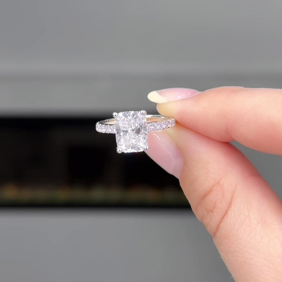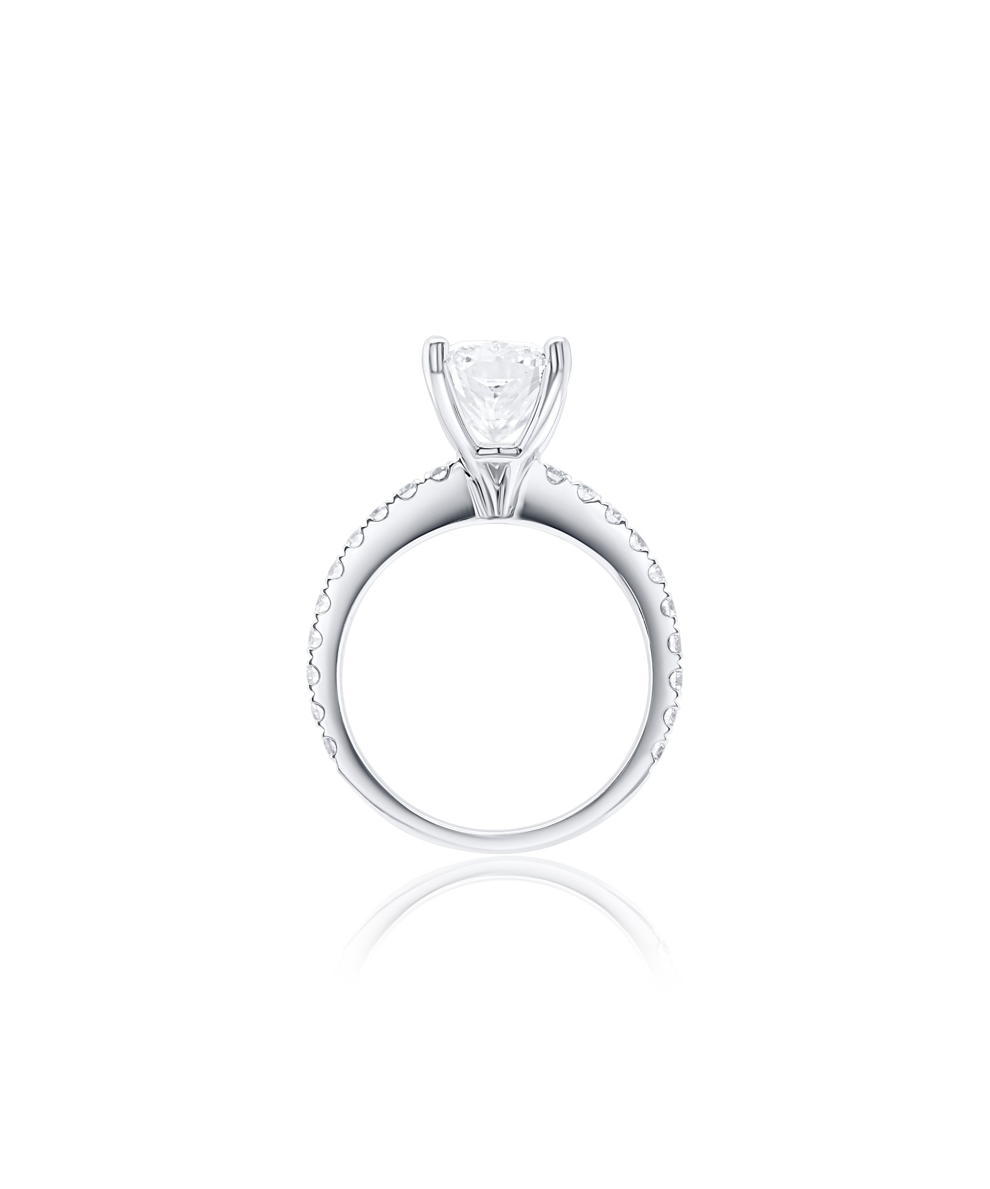Romantic and endlessly luminous, this ring was designed around the connection of bringing two people together, forever. The subtly rounded silhouette of the center stone is elongated for a flattering and elegant look that captures light from every angle. This particular design feels modern but minimal, with the added touch of sparkle on the diamond band to complete it.