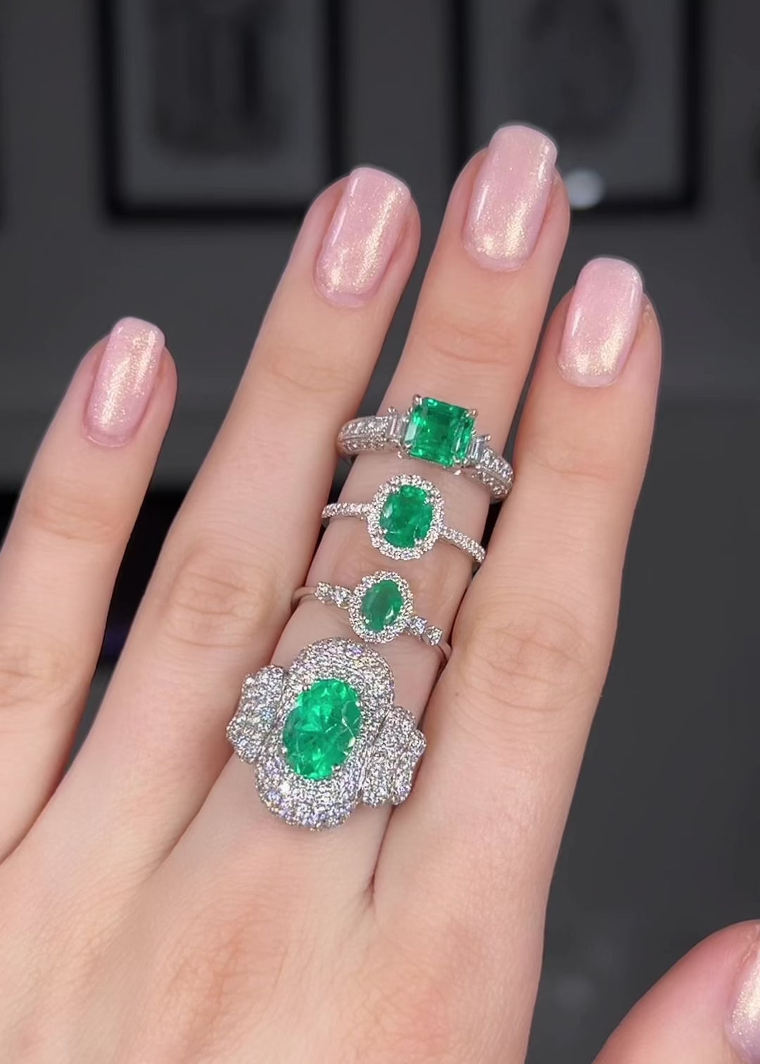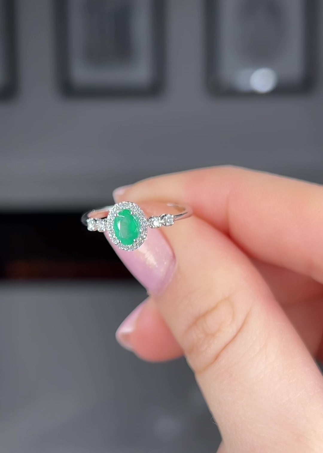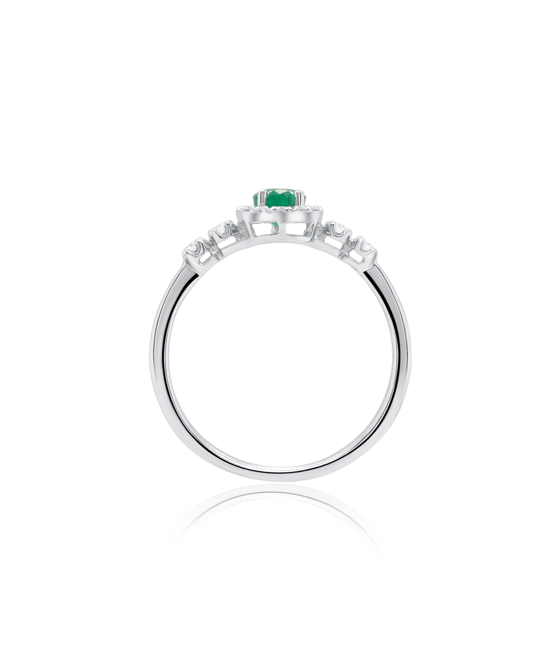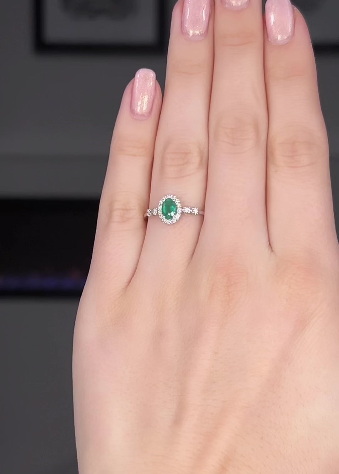 Adorn yourself with Emerald and Diamonds, you deserve it! This stunning ring features a brilliant oval cut vibrant green Emerald stone. Complete with a sparkling diamond halo surround, this masterpiece also features two prong set diamonds on either side of the center stone to further enhance it's natural beauty. Add a pop of green to your fine jewelry collection and wear this ring as part of your everyday look!