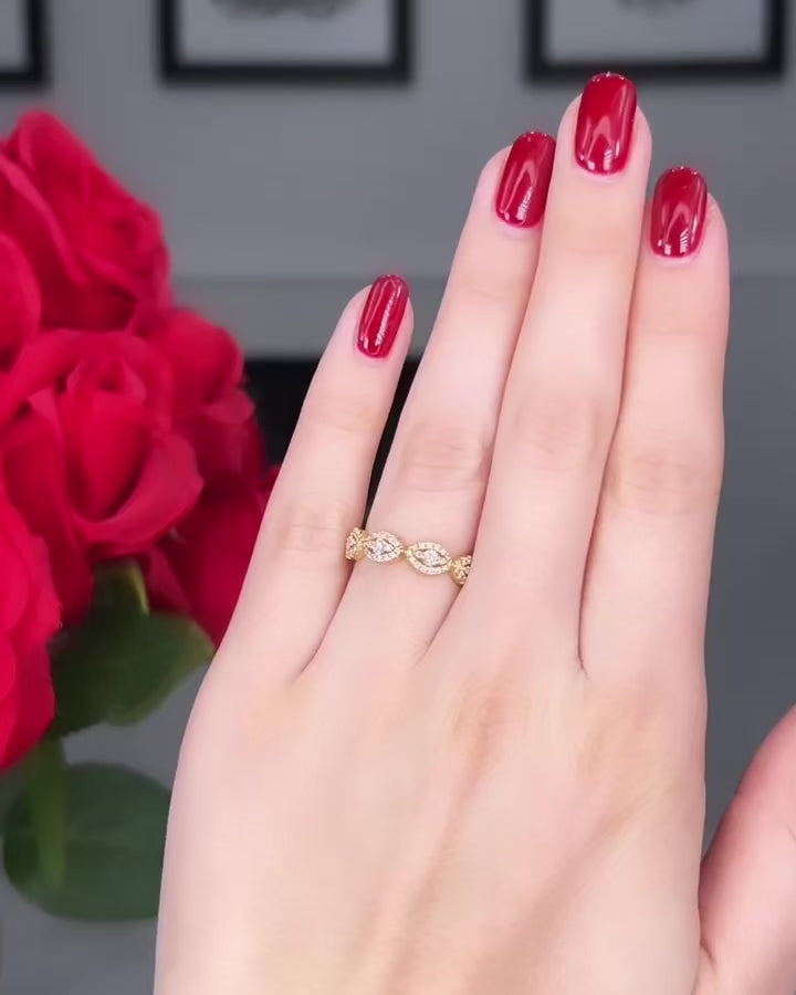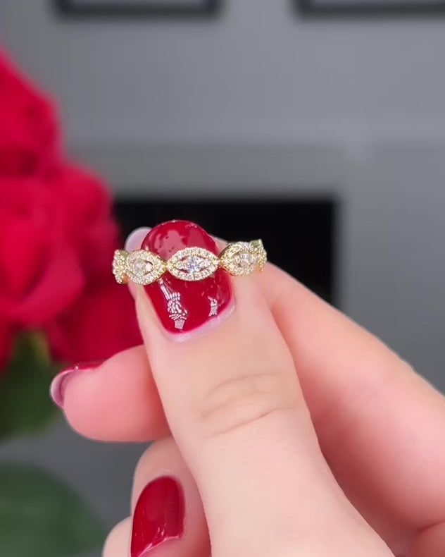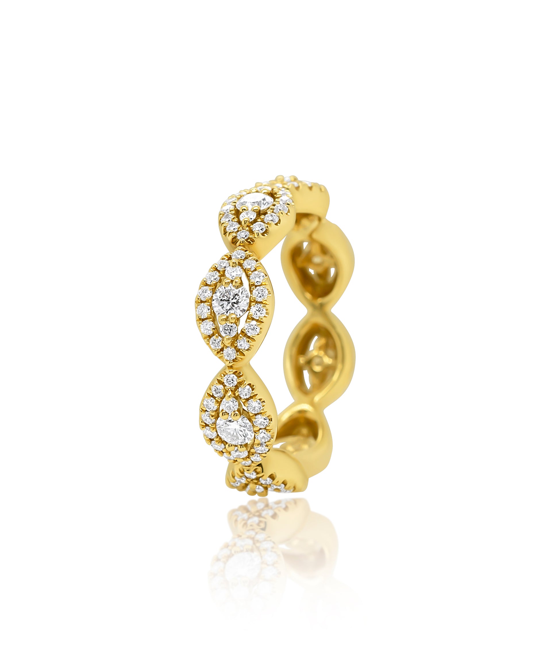 Crafted from everlasting yellow gold, this band features a mesmerizing criss-cross design. As the bands twists and turns, it gracefully embraces singular white diamonds, each one a radiant symbol of the singular bond shared between two hearts. With this captivating design and unparalleled elegance, show your endless love and celebrate with this band.