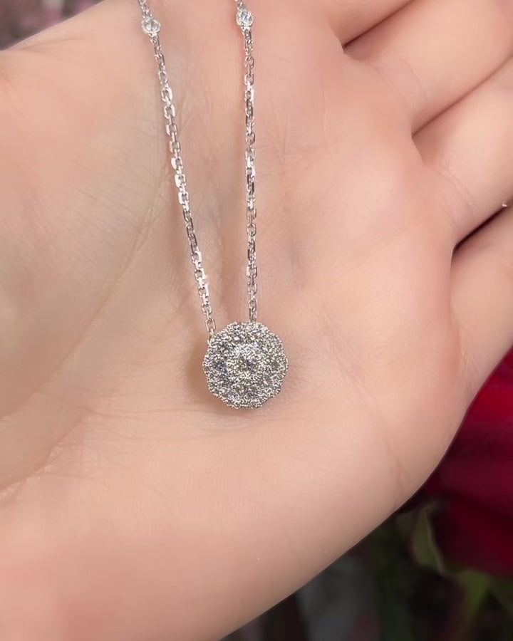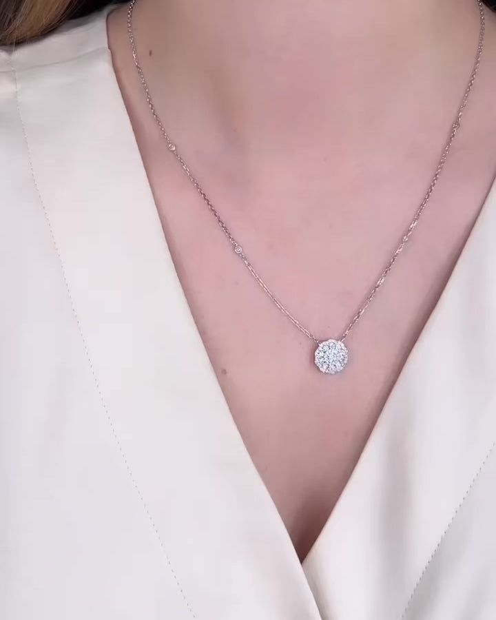 The beauty of this Diamond Cluster Flower Necklace is mesmerizing. We decided to complete this stunning piece with an 18K white gold chain with white diamonds joining the links together in perfect harmony.
