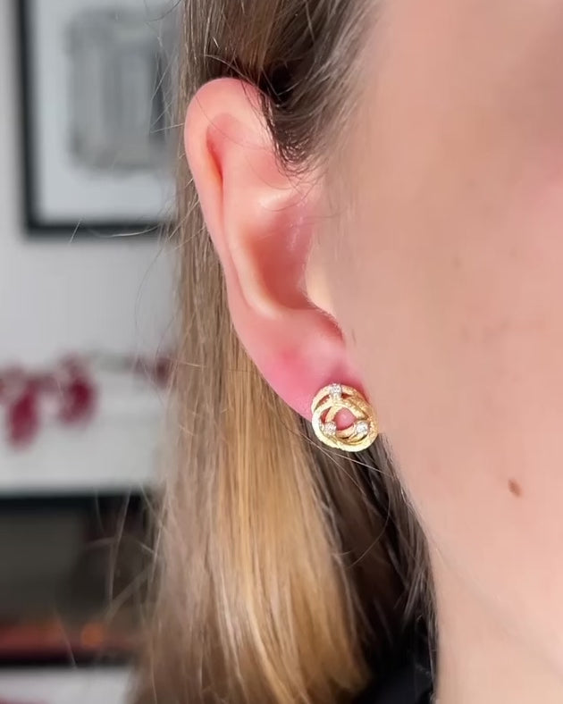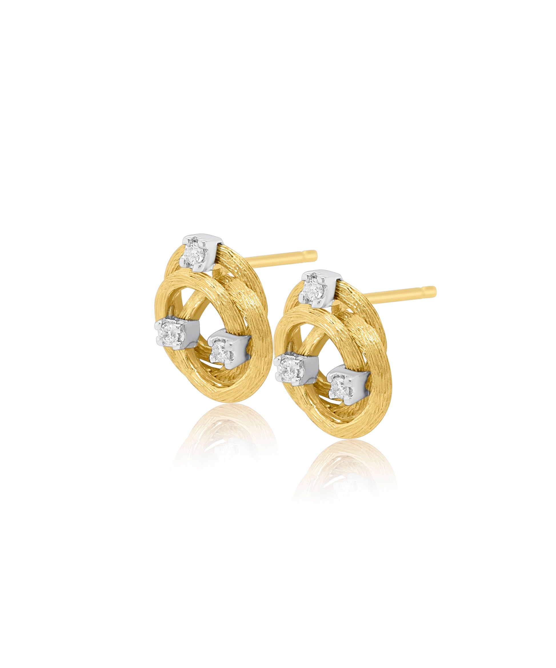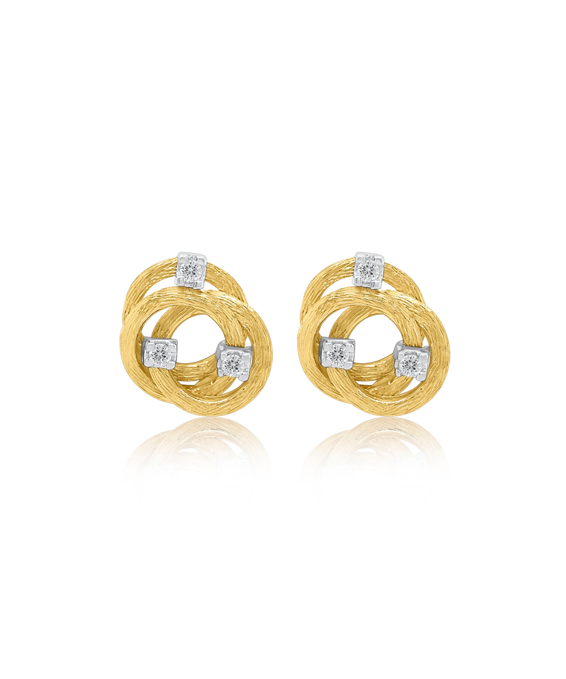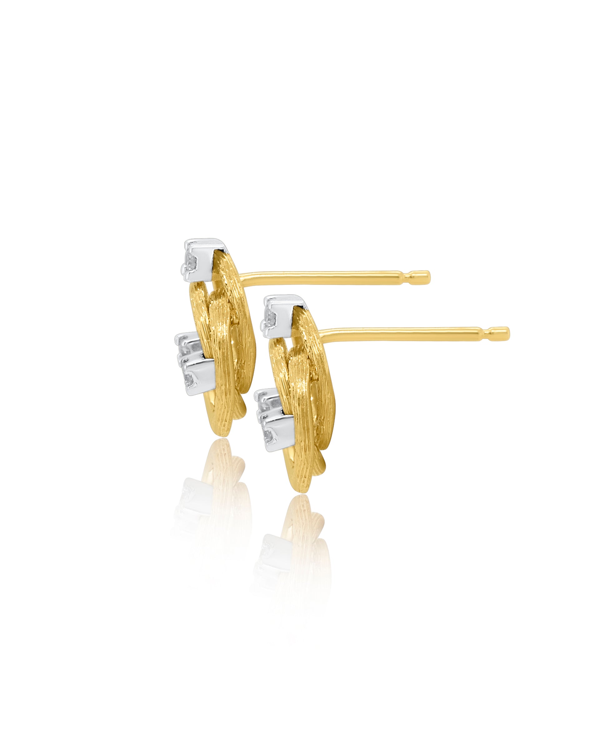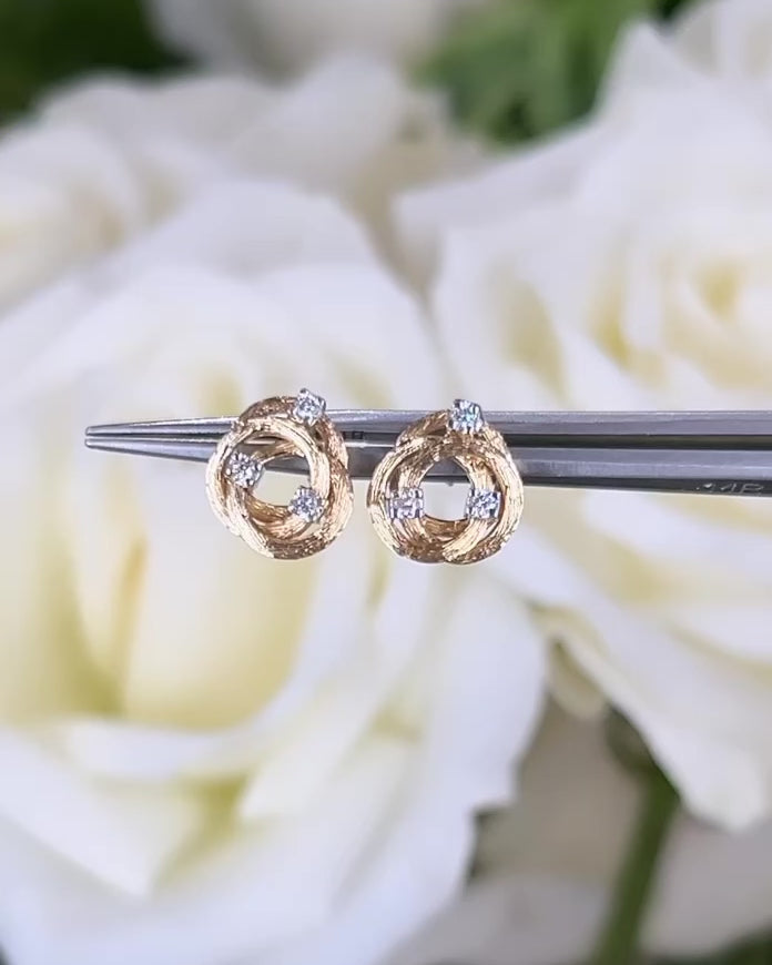 This lightly textured 14K yellow gold wire is looped into a relaxed knot and paired with three sparkling white diamonds set in 14K White Gold. These earrings catch light from every angle and will add a refreshing sheen to your everyday look.