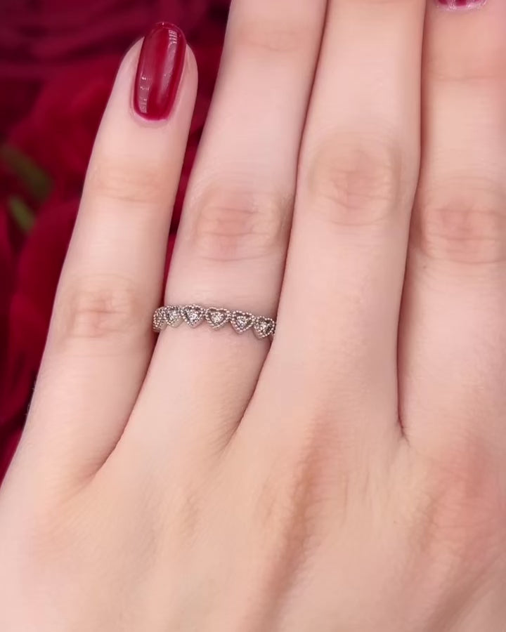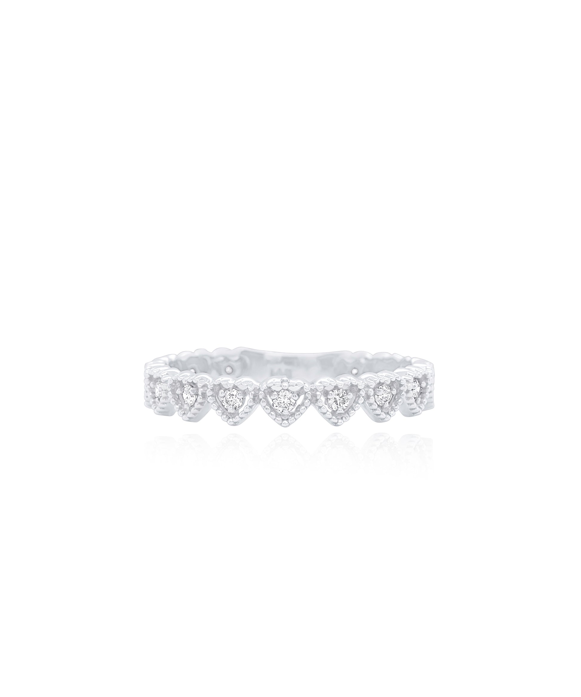 Created in 14K white gold, this playful stacking band features round brilliant white diamonds in the center of sculpted beaded hearts. These sparkling diamonds add shimmer and shine to this loveable look! Want to take this ring a step further? There's room for a customizable engraving!
