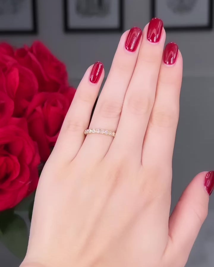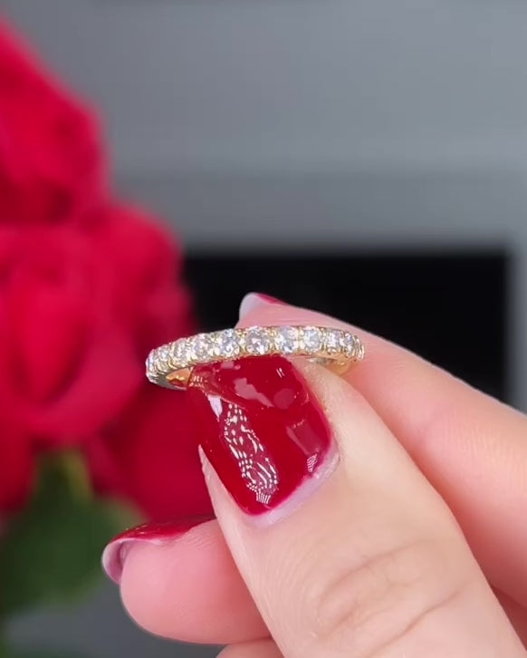 Mark the dawn of your beautiful journey with our 'New Beginnings Diamond Band", an exquisite expression of love and commitment. Crafted in warm 18K yellow gold, this grand band is adorned with dazzling round brilliant white diamonds set halfway around. Embrace the magic of your new beginnings together and add this band to your wedding set!