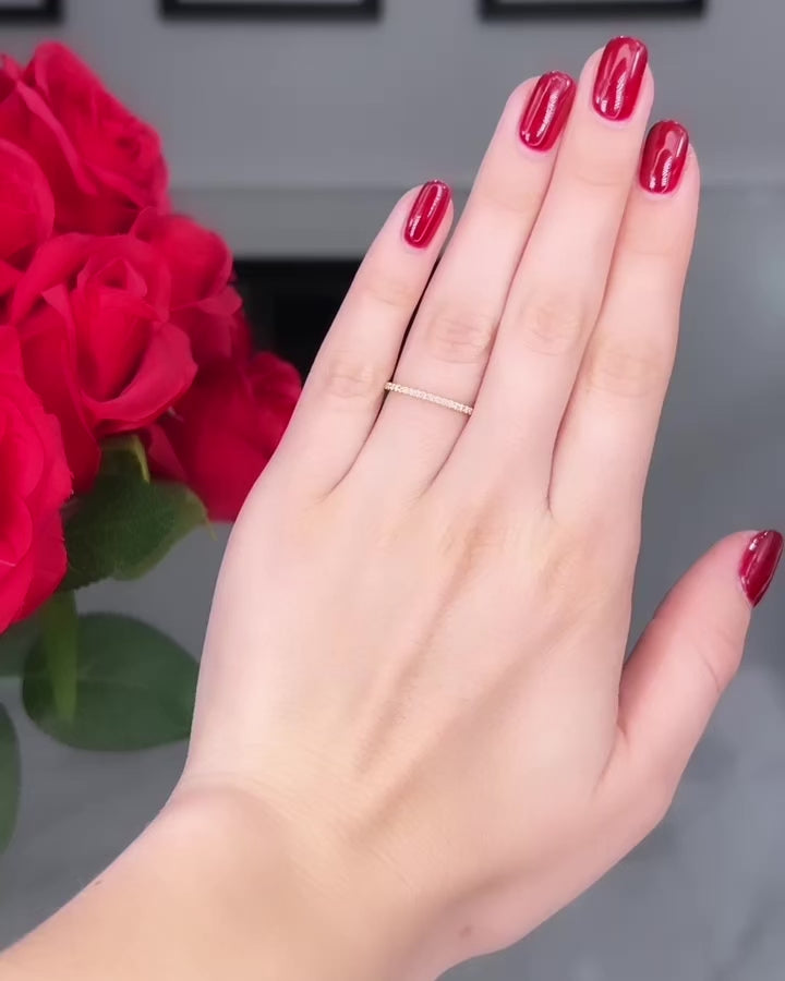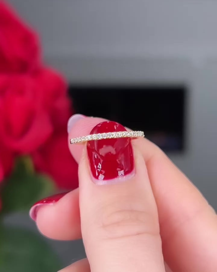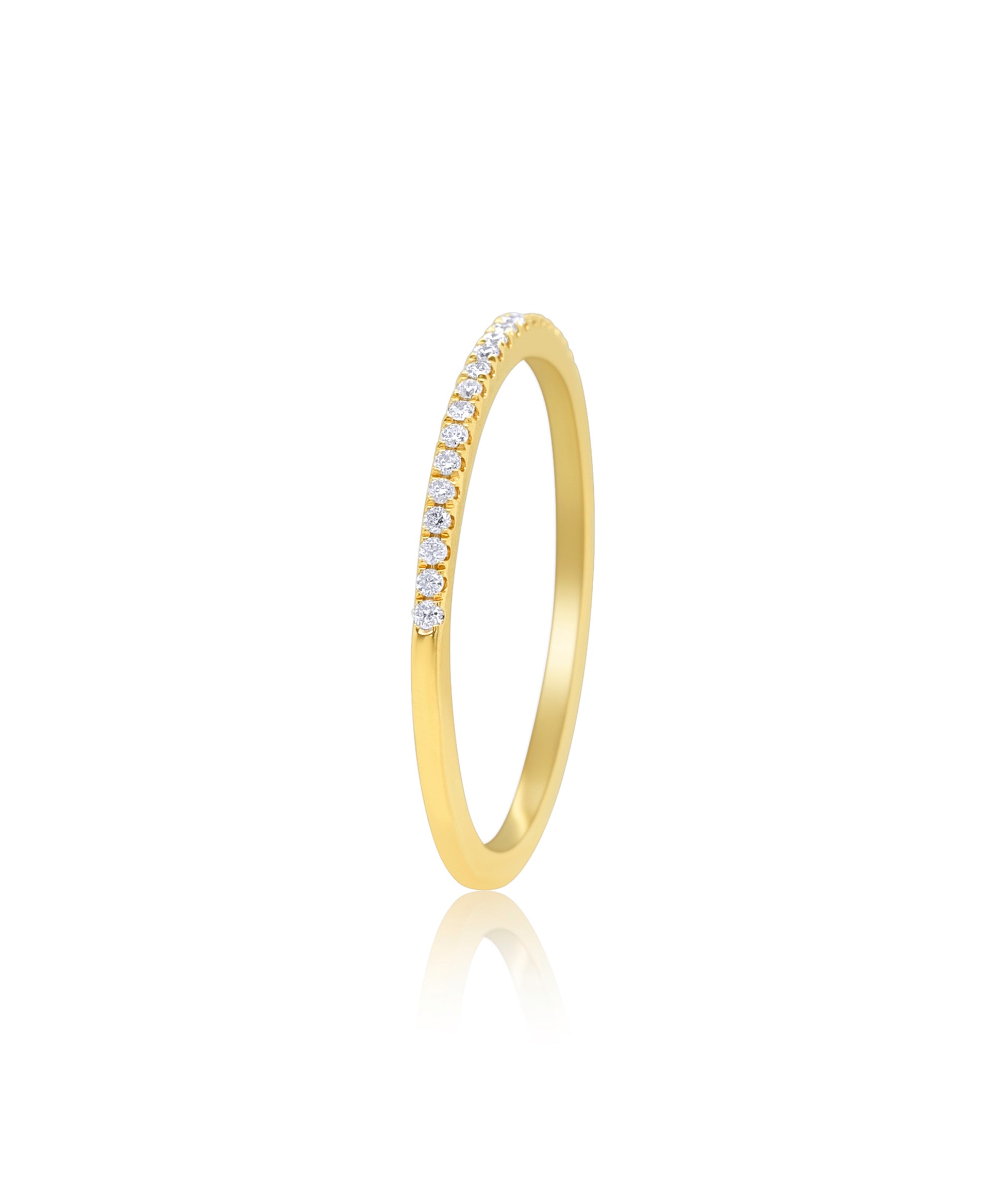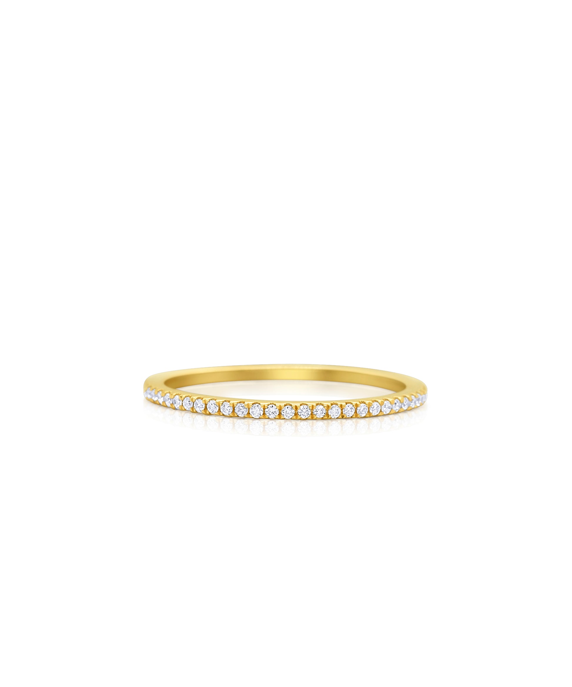 Crafted from luxurious 18k Yellow Gold, this slender wedding band exudes quiet sophistication with its sleek profile and understated beauty. Adorned with sparkling round brilliant white diamonds set halfway around the band, each stone reflects the radiance of your enduring commitment. This 'New Classic Band' will subtly compliment your engagement ring without taking away from your center diamond. This modern design adds a touch of sparkle to your love story.