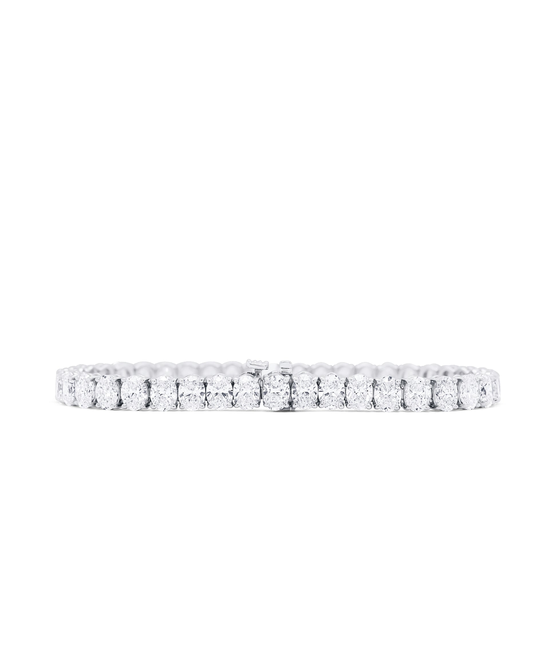 This modern take on a classic diamond tennis bracelet flows seamlessly around the wrist with 42 oval cut diamonds. Whether layered with other bracelets or worn alone, once you have this on, you'll understand why you will never want to leave the house without it.