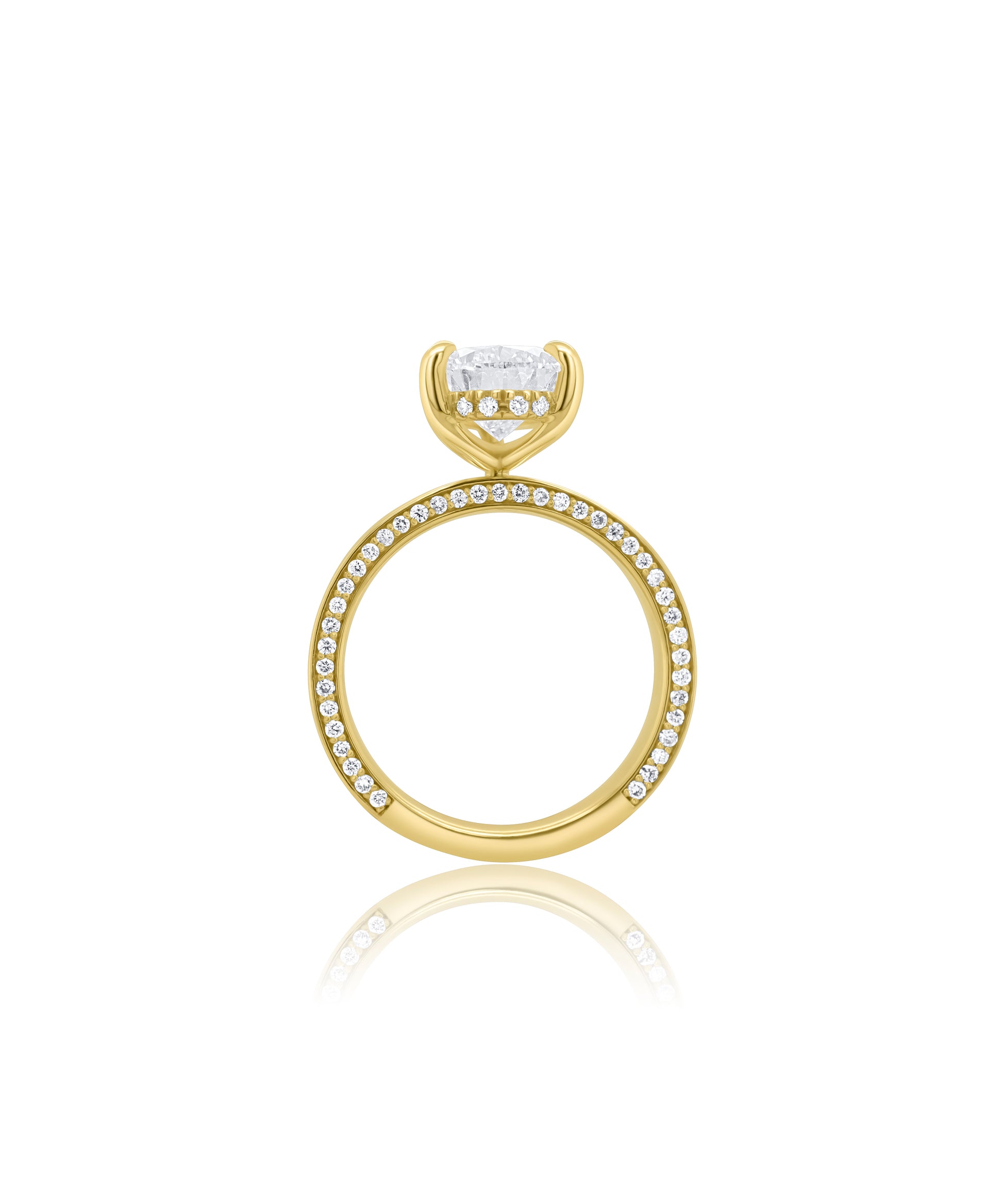 Crafted to be as unforgettable as the statement it makes, this engagement ring features a stunning pear cut diamond set with our signature Boston Diamond Cigar Band. This band offers a striking contrast in comparison to the sleek curves of the pear shape. To further complement this design, a one of a kind detail that sets this ring apart can be seen from the profile of the band. A row of pave set diamonds lining each side, adding a secret shimmer that is rarely found anywhere else. This design is a story of bold yet romantic balance. Made to symbolize a love that is deeply personal, beautifully unique and built to shine for a lifetime.