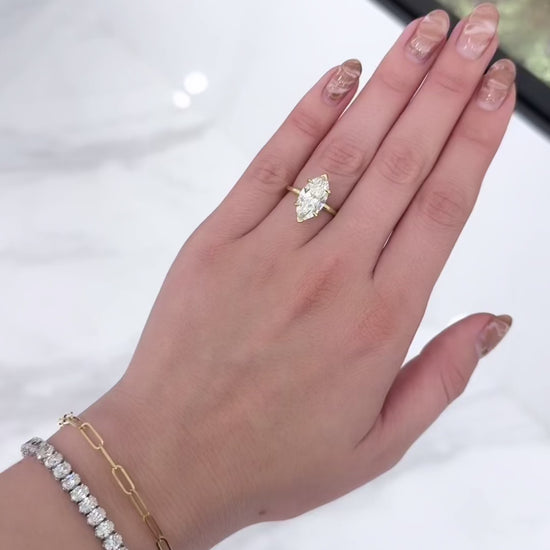 This engagement ring is designed for those who love to make an entrance. Bold yet classic, this engagement ring showcases a stunning marquise cut diamond, celebrated for its elongated silhouette and eye-catching brilliance. This unique shape creates a flattering, dramatic look with its pointed ends and curved edges reflecting light with every movement. Beneath the center stone there is a secret shimmer of pave set diamonds, a detail only revealed up close and is perfect for someone who believes that beauty is in every layer.
