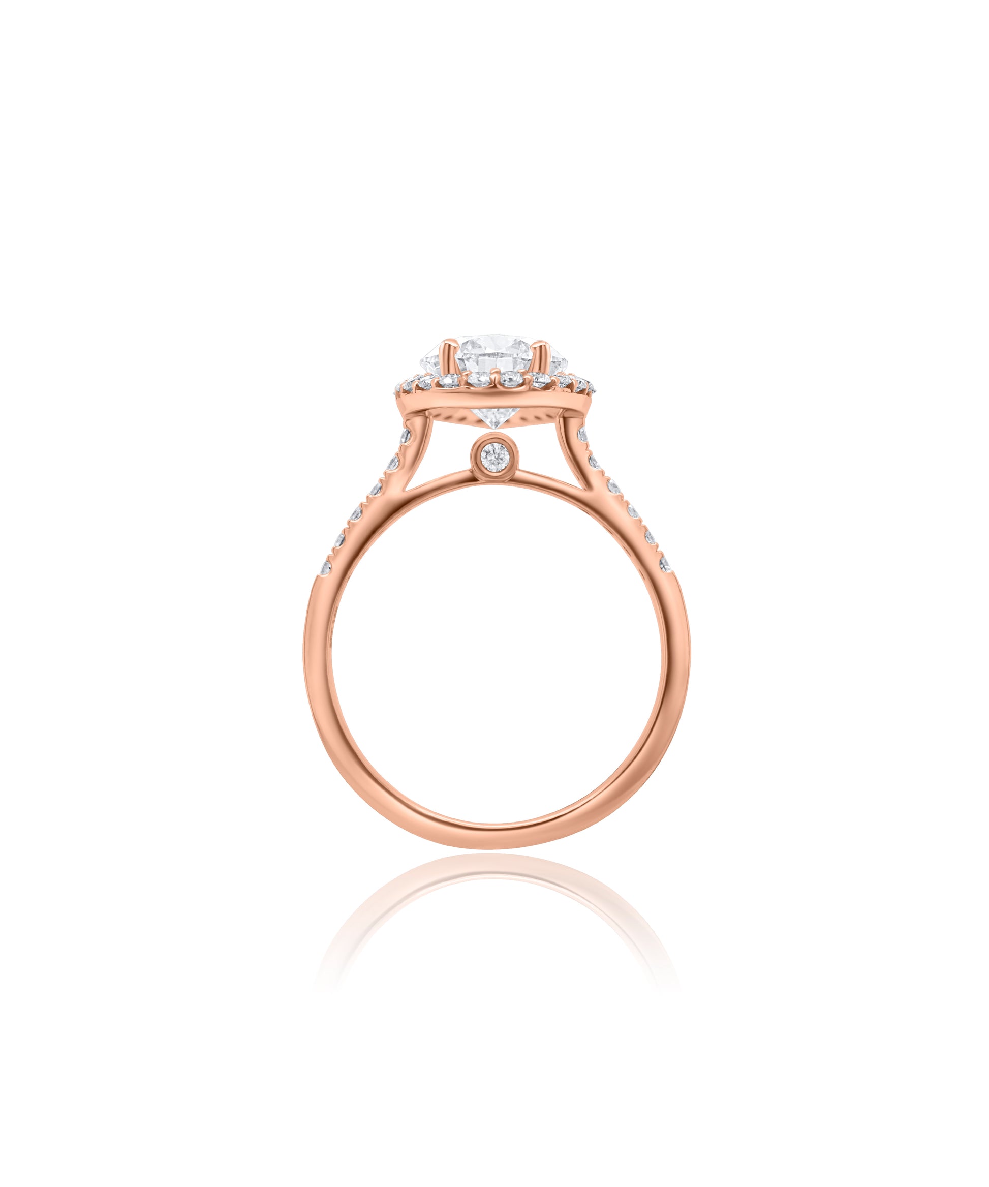At the heart of this design lies a luminous pear cut diamond framed by a halo of pave set diamonds. The diamond halo makes the center diamond glow with amplified fire and presence, creating a shining silhouette of light and sparkle. The cathedral setting, lined with shimmering pave diamonds, rises elegantly to meet the center, adding height and structure. As a final touch to this unique design, a sparkling white diamond is set beneath the diamond basket, a secret detail symbolizing the beauty of loves foundation, visible only in moments of closeness. From every angle, this ring is designed to capture the heart, with its warm rose gold glow to the unforgettable expression of love through each diamond.