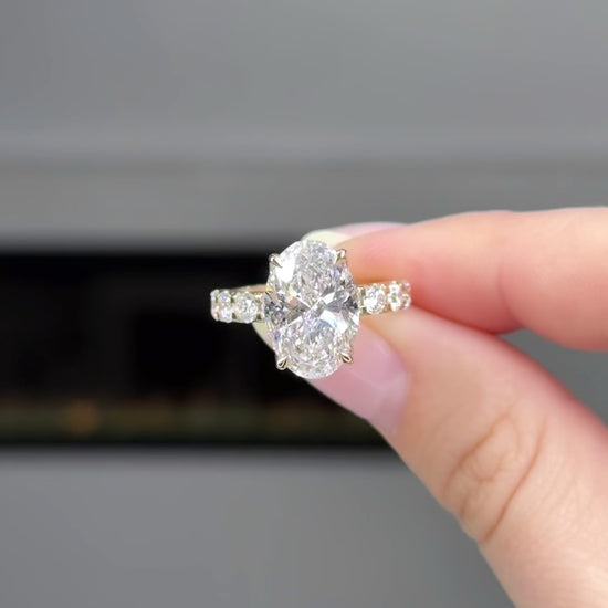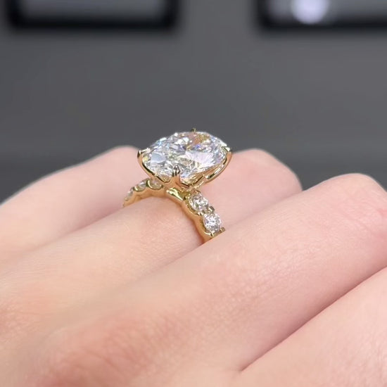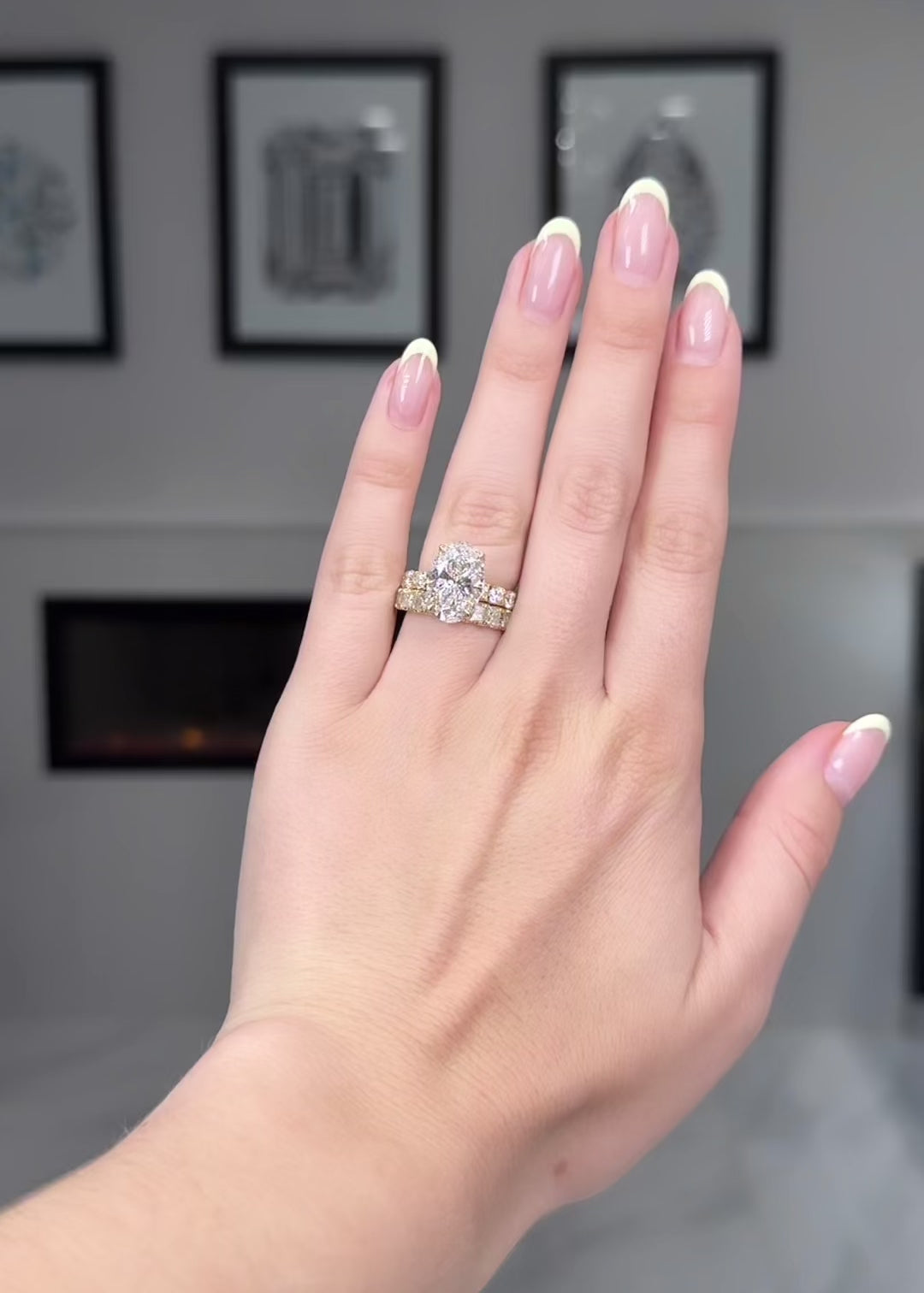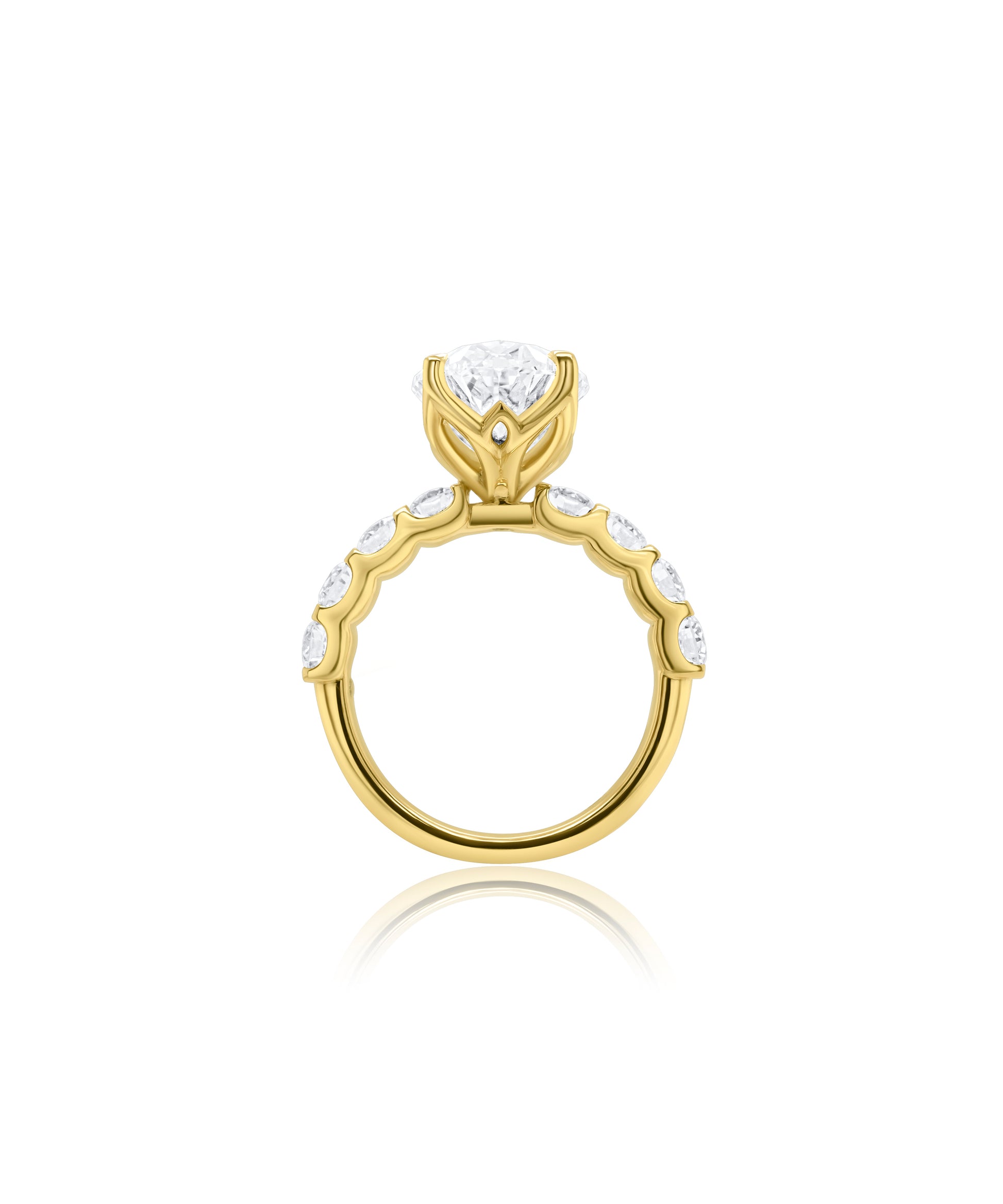 What makes this ring unlike any other lies in the hidden detail that only you will know: three sparkling round diamonds set on the inside of the band. This secret detail adds a personal touch to a piece that is already so full of sentiment and meaning. Each diamond represents love, strength and commitment. The most important parts of any relationship. The center diamond is elevated by our signature four prong petal setting. To complete this ring, eight stunning round cut diamonds are set in the band to enhance the center stone's natural brilliance. A bold but modern design, created for someone who wants to make a statement that will last forever.