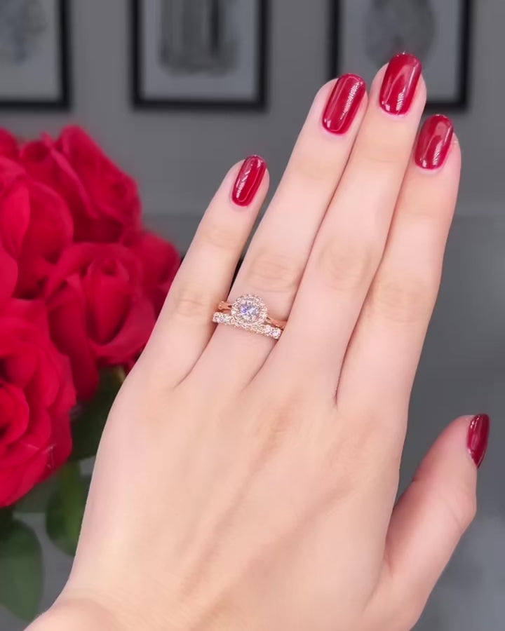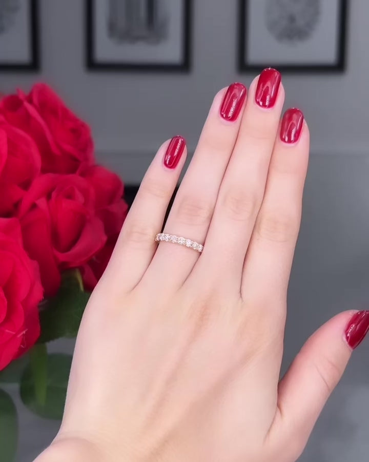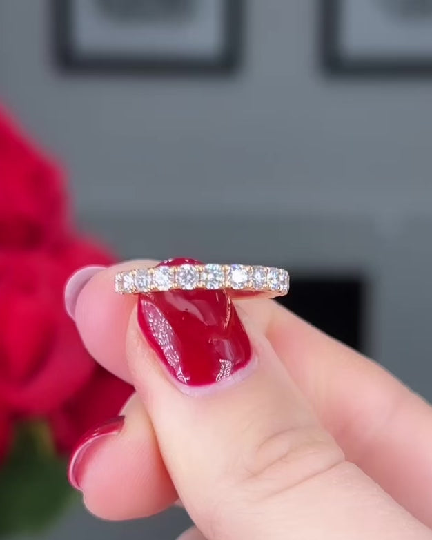 Enter your 'Wedding Glow Era' with our Rose Gold Glow wedding band. Elevate your love story with the pink hue of 18K Rose Gold. This band exudes warmth and romance, casting a mesmerizing glow with every glance. With 11 sparkling round brilliant diamonds set halfway around this band, it is the perfect expression of your shared journey together.