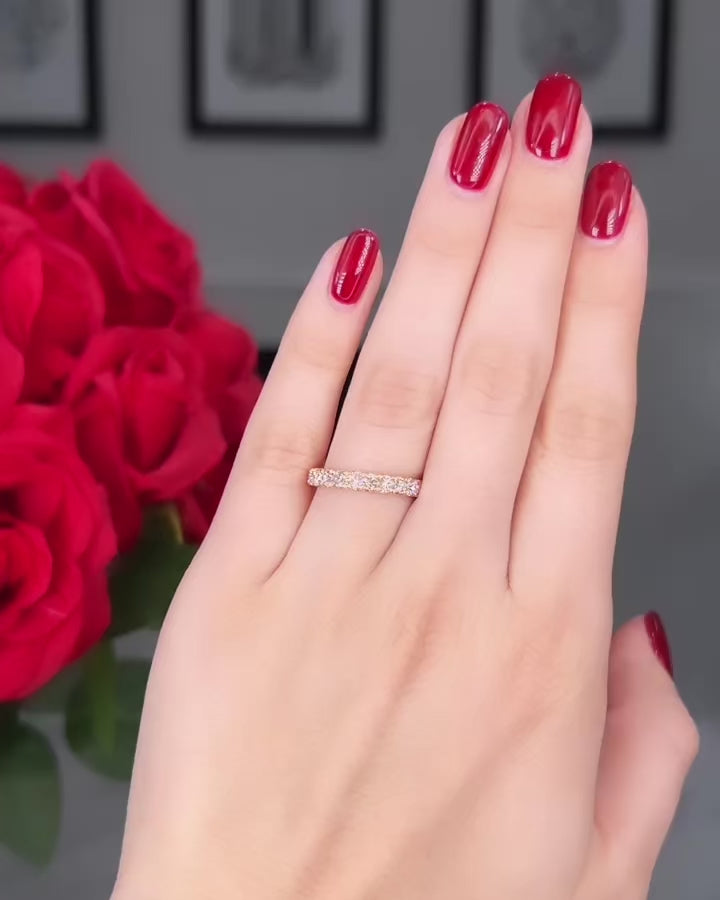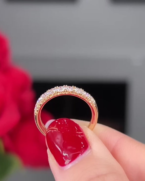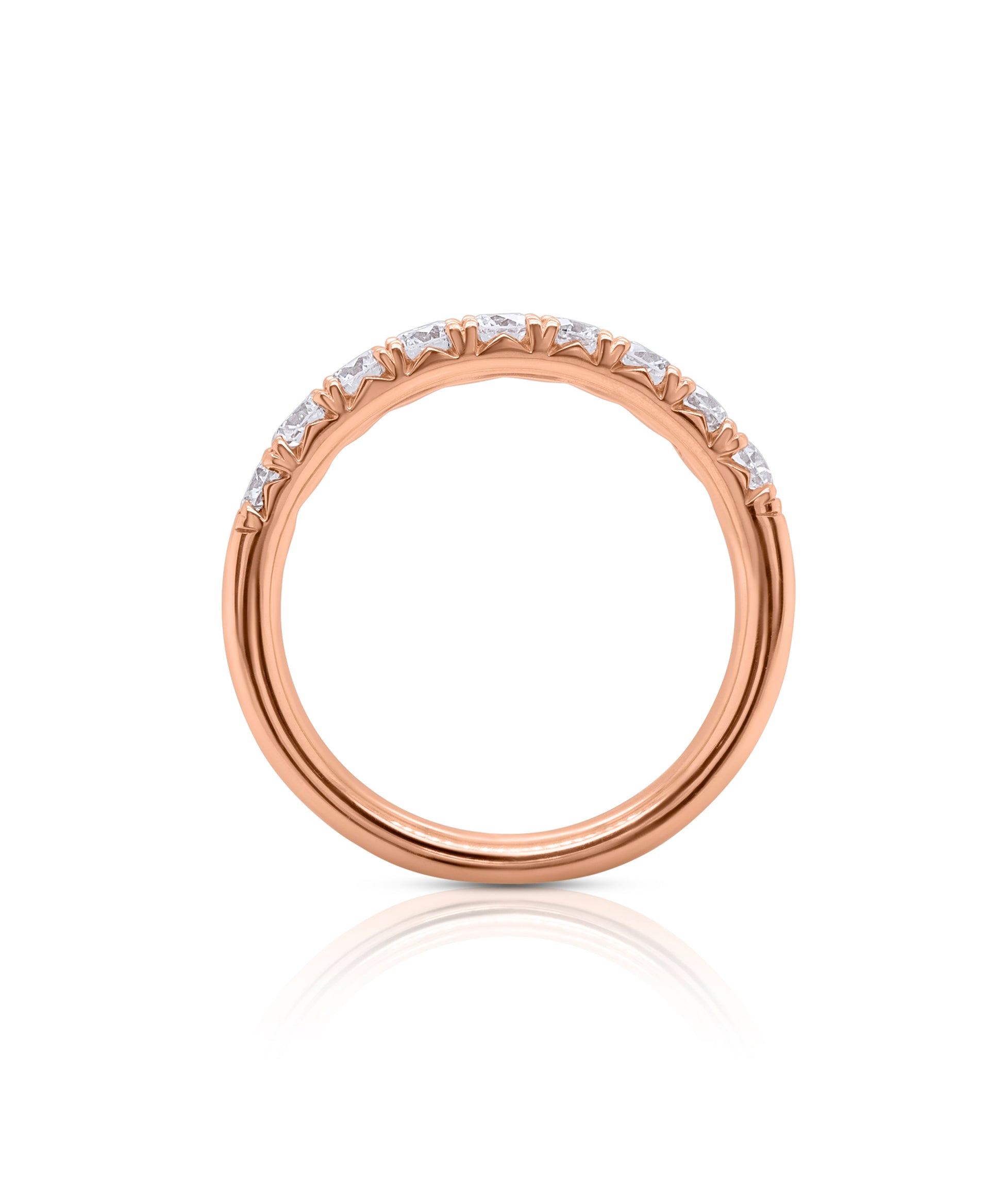 Indulge in the timeless elegance of this Rose Gold Half Eternity Band. Fashioned from lustrous 18K rose gold, this band welcomes romance and love with its warm hue and graceful curves. Nine sparkling diamonds adorn the band and each one is a symbol of the precious moments shared that brings you together. Look closely at the side of this band and you can see the intricate design where the diamonds are set.
