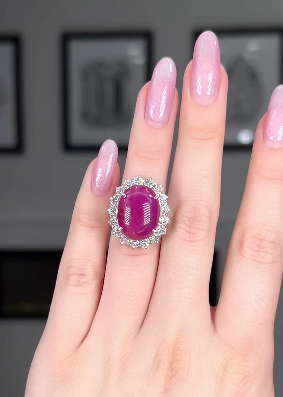 This extraordinary Ruby Cocktail Ring commands attention with its deep fiery hue and flawless smooth finish. Encircled by a delicate yet dazzling halo of brilliant diamonds, the richness of the ruby is further intensified, radiating warmth and passion with every movement. This one of a kind masterpiece is the ultimate expression of timeless luxe.