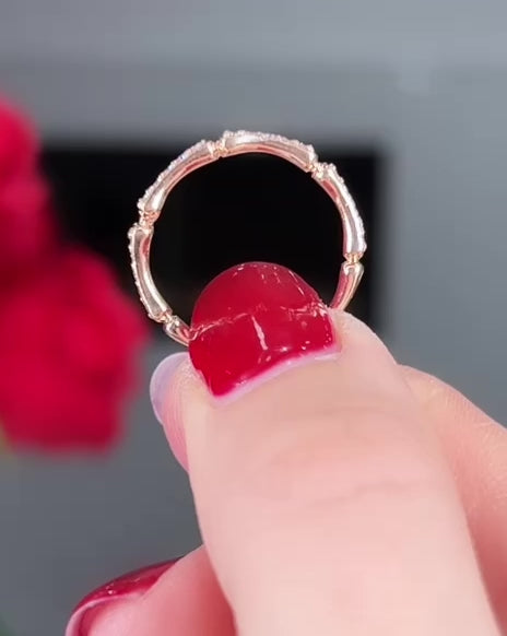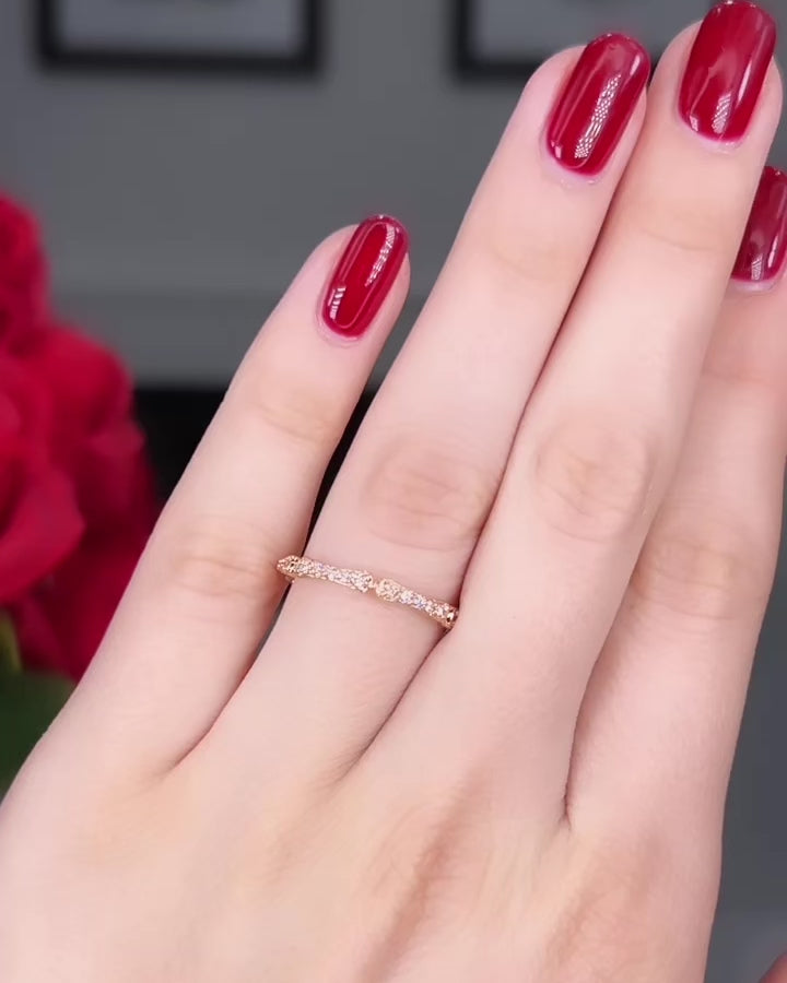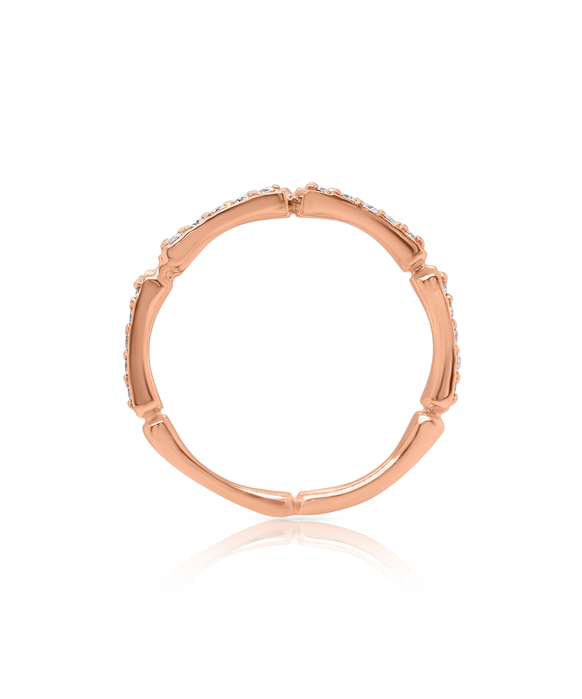 This uniquely handcrafted ring features six links of luxurious 14K rose gold. Pave set diamonds are prong set halfway around this band to add a hint of sparkle to your everyday look. The diamonds catch the light from every angle, making this a stunning symbol of your eternal connection.