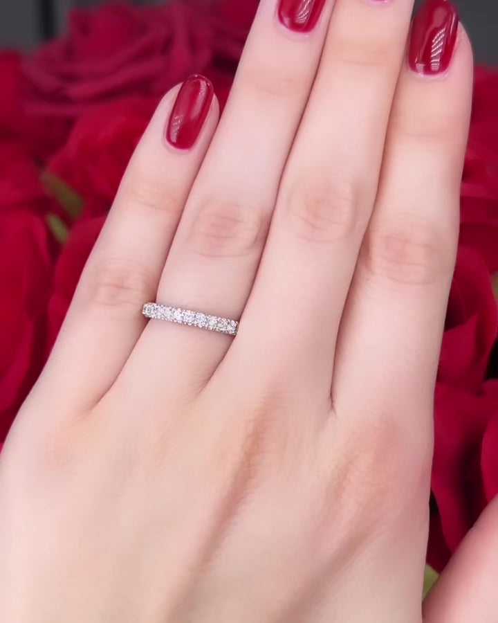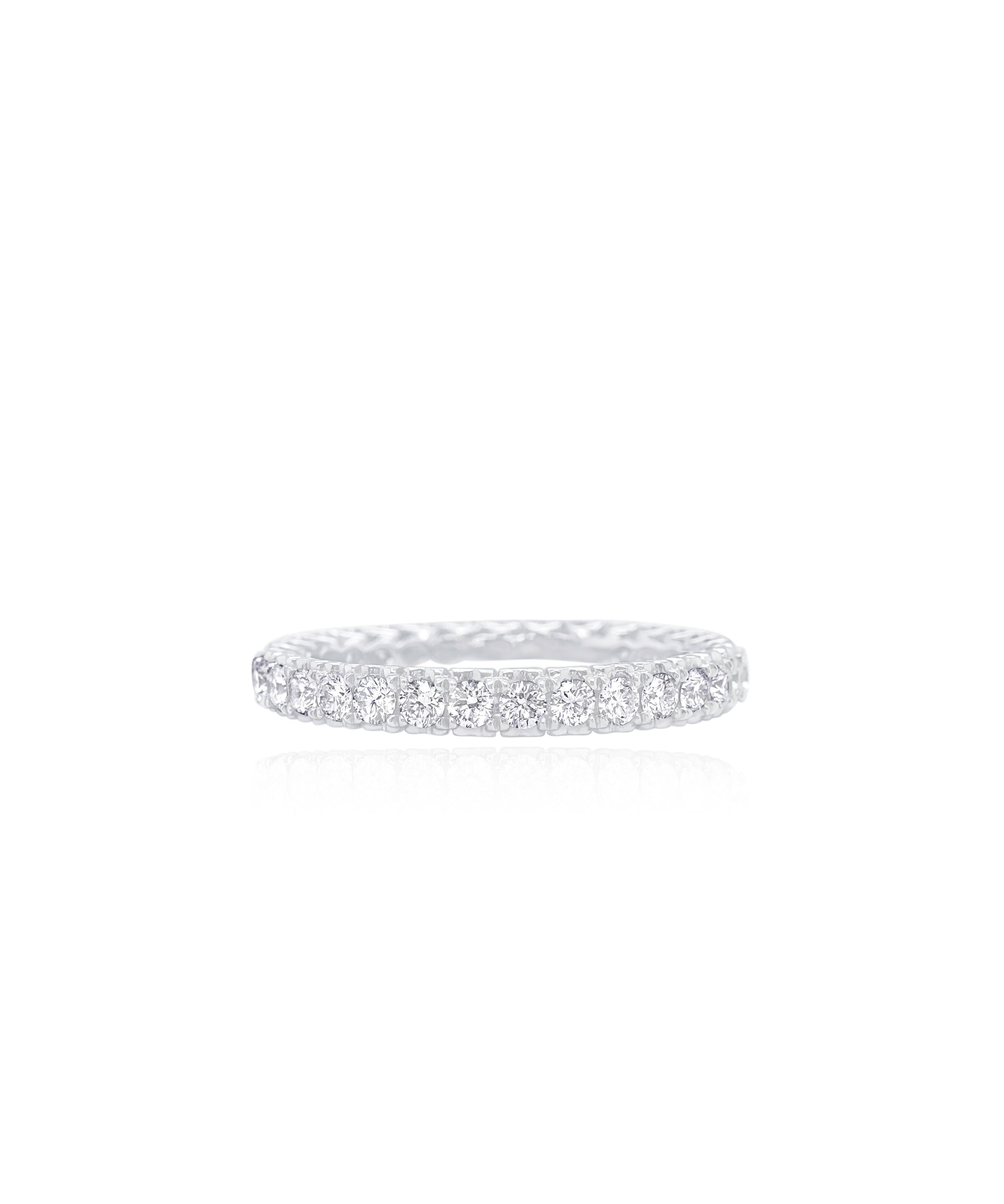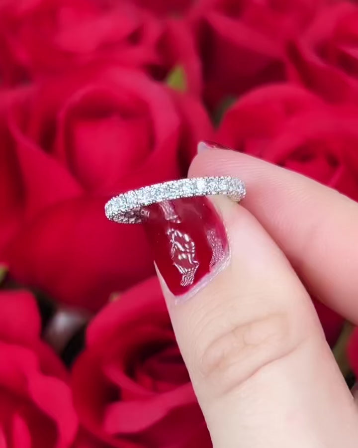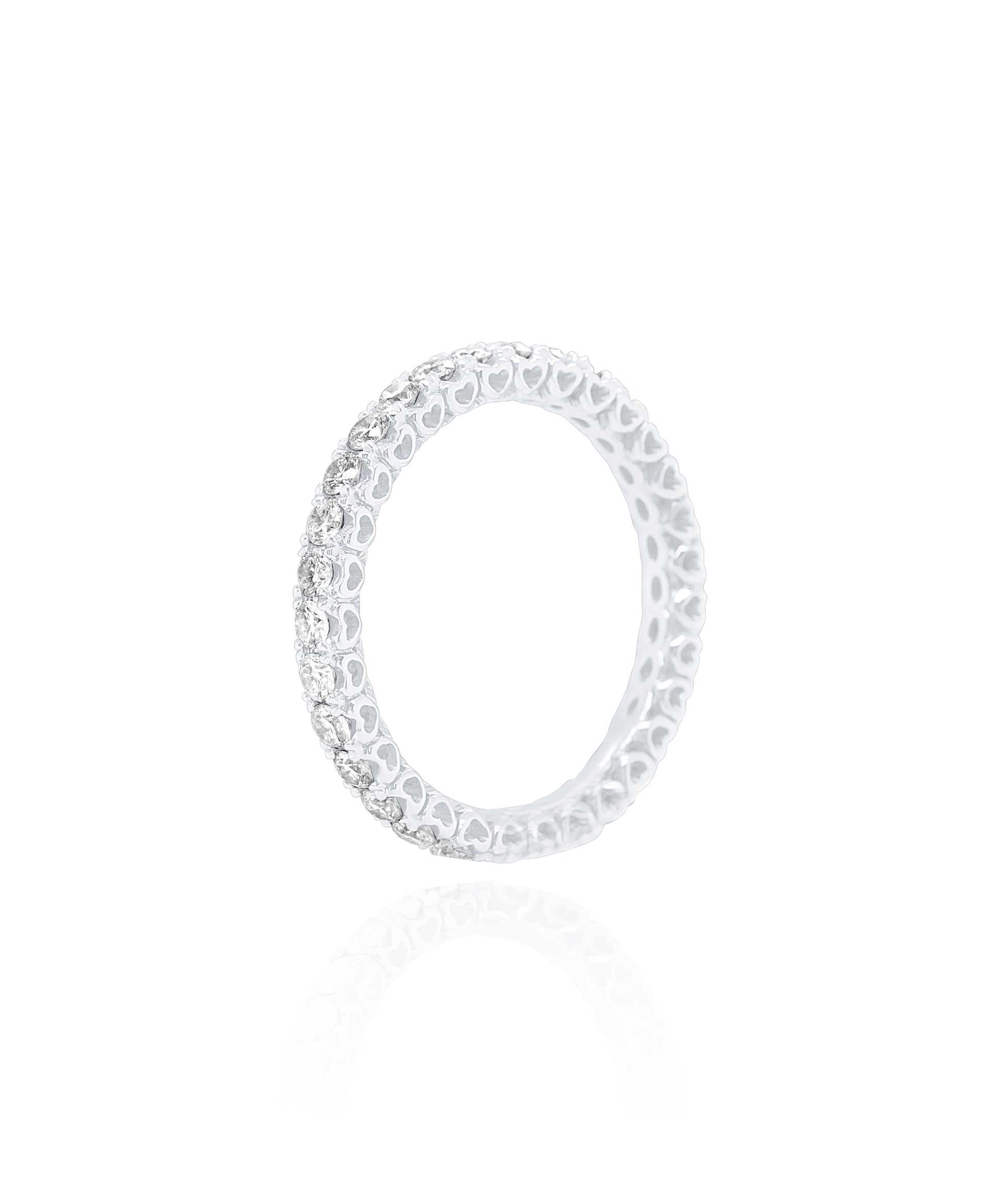 Wow her with a sweet surprise! From the front, this ring has beautiful brilliant white diamonds that sparkle and shine in the light. When you look closely at the profile of this ring, the beautiful diamonds are set in heart shaped prongs carefully sculpted out of 18K White Gold. She will forever adore this playful twist on a classic design!